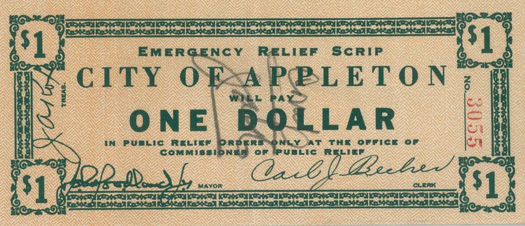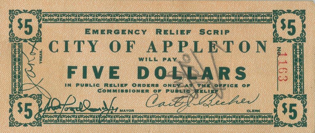 The City of Appleton issued scrip for use by its Unemployment Relief Department. It was paid out to those who did work for the City as part of the Relief Program. The scrip was issued in denominations ranging from $.05 to $5.00.