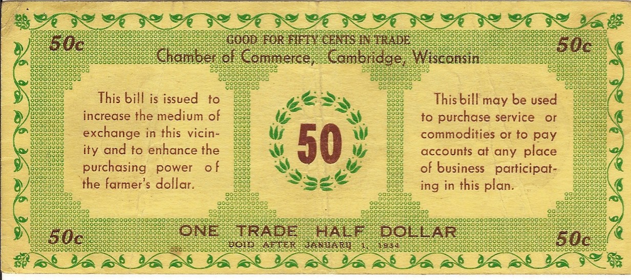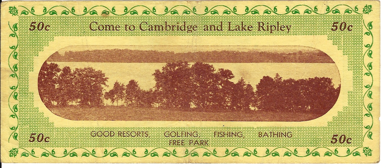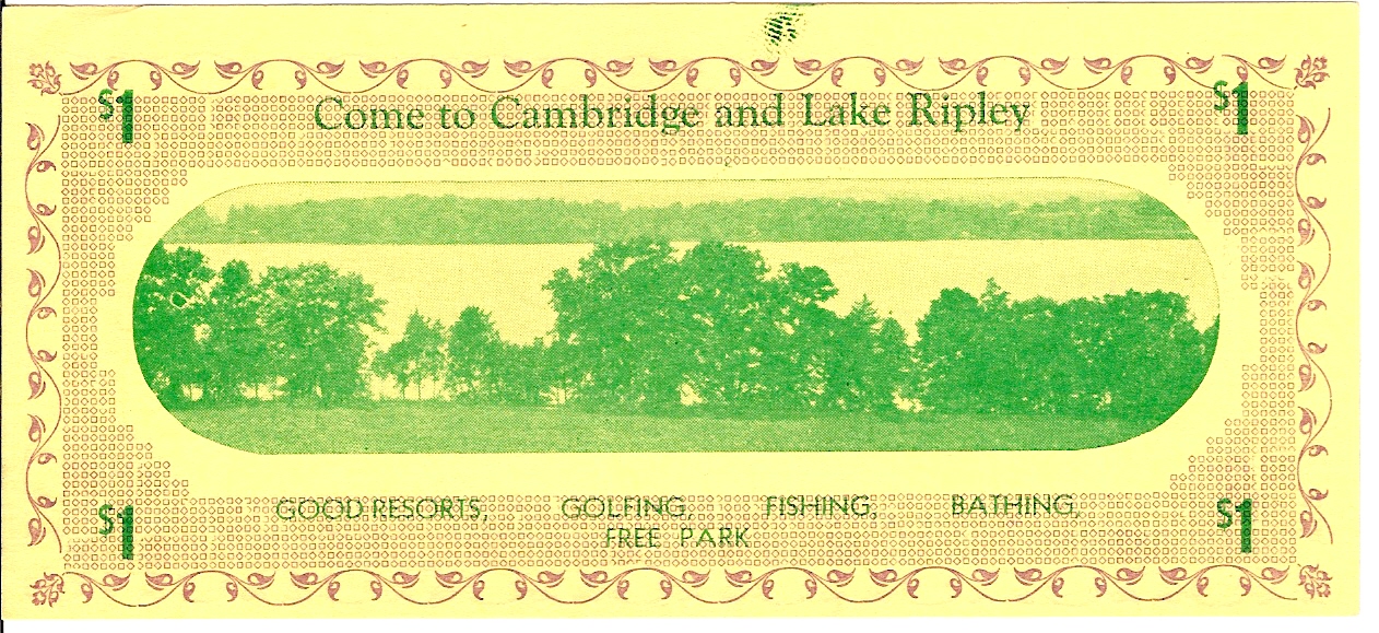 The Cambridge Chamber of Commerce issued scrip beginning on February 25, 1933. The scrip was issued to assist local farmers and to provide a medium of exchange in the community which was suffering from a lack of available cash due to bank failures.