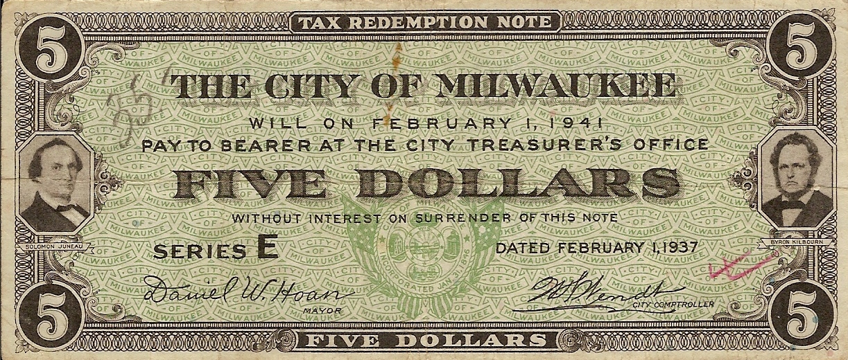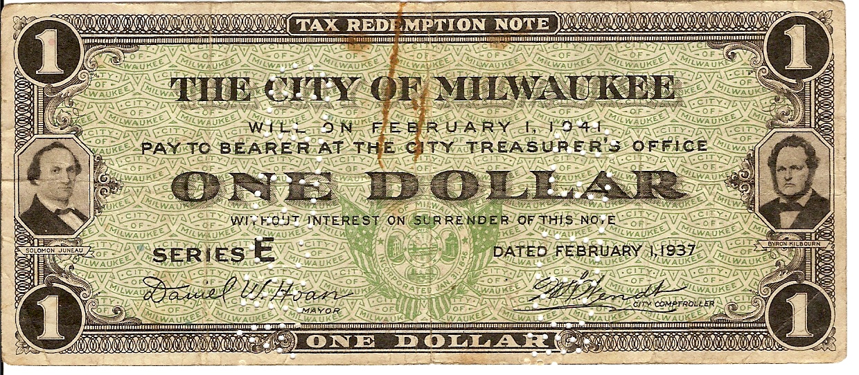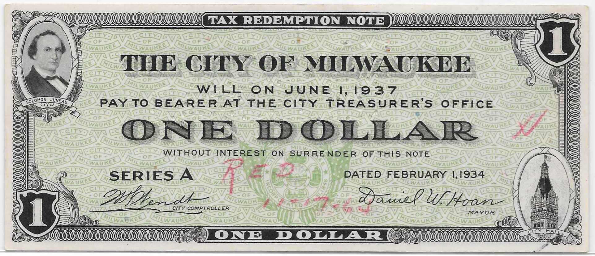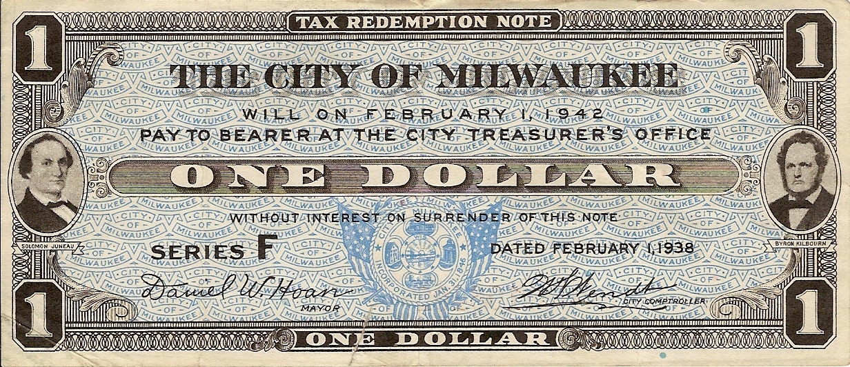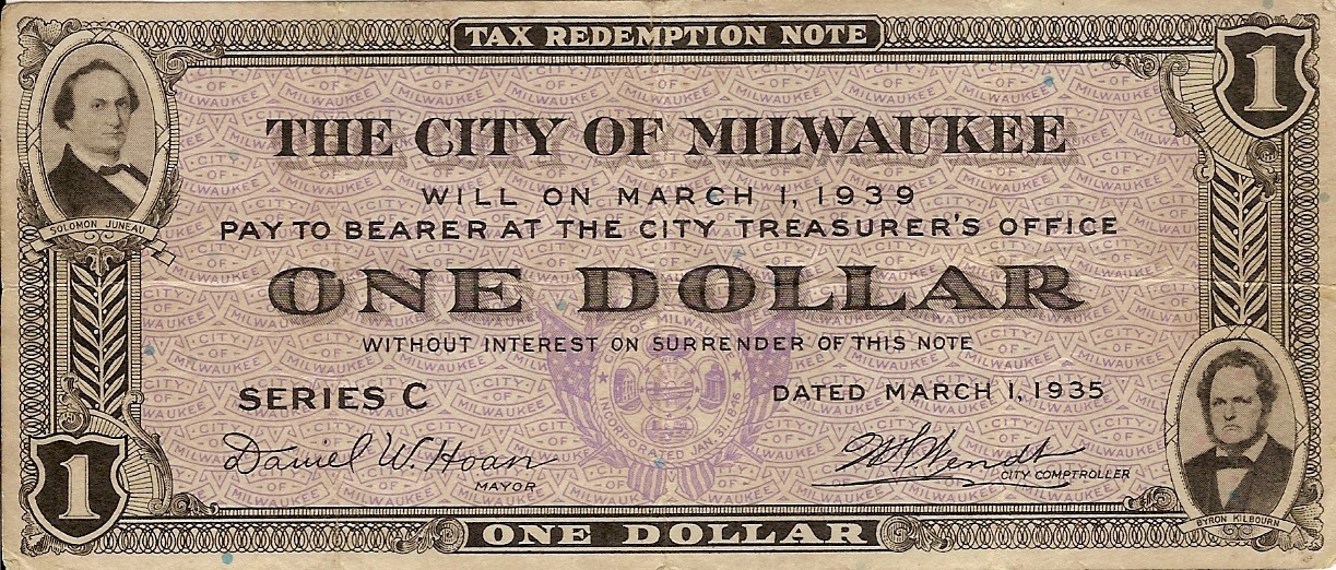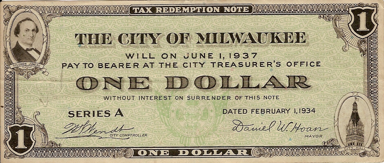 The city of Milwaukee faced a record number of defaults on real estate taxes pinching cash flow. Mayor Daniel Webster Hoan proposed a scrip plan at the end of 1932 but it was rejected.