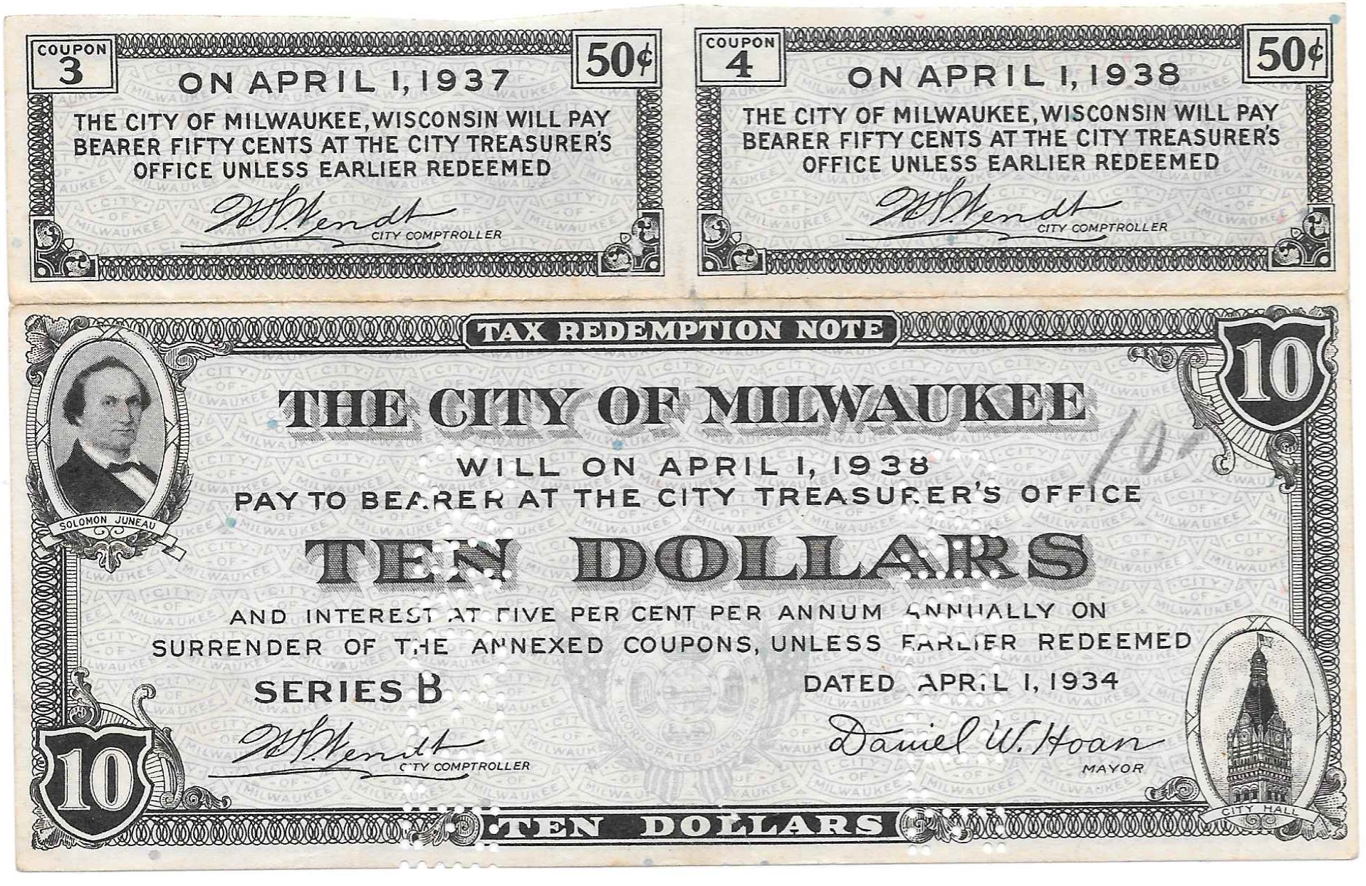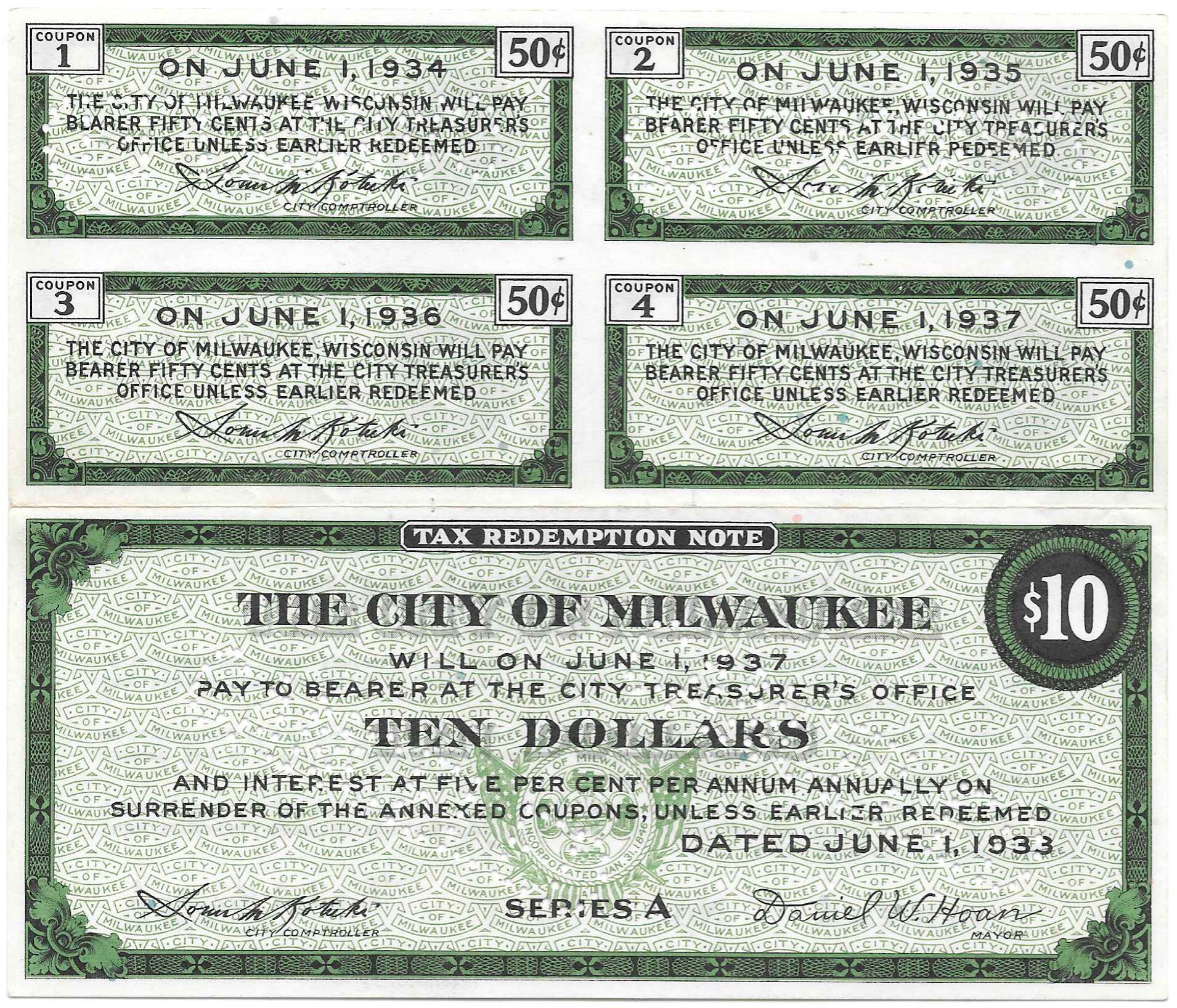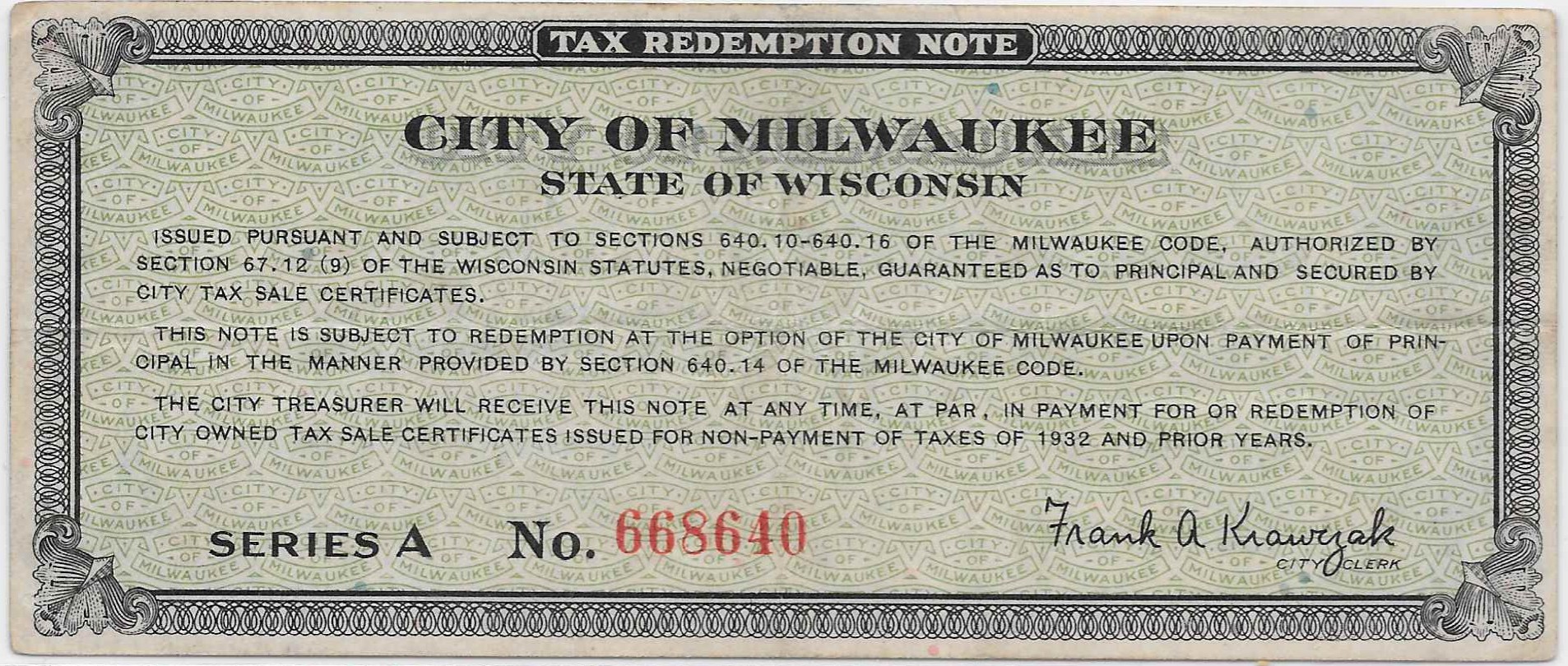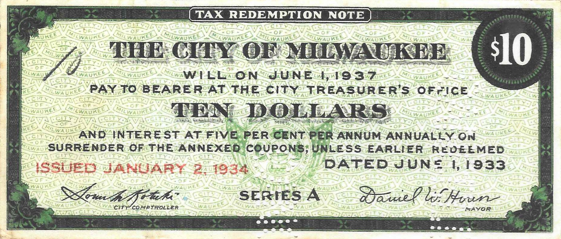 The city of Milwaukee faced a record number of defaults on real estate taxes pinching cash flow. Mayor Daniel Webster Hoan proposed a scrip plan at the end of 1932 but it was rejected.