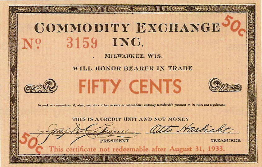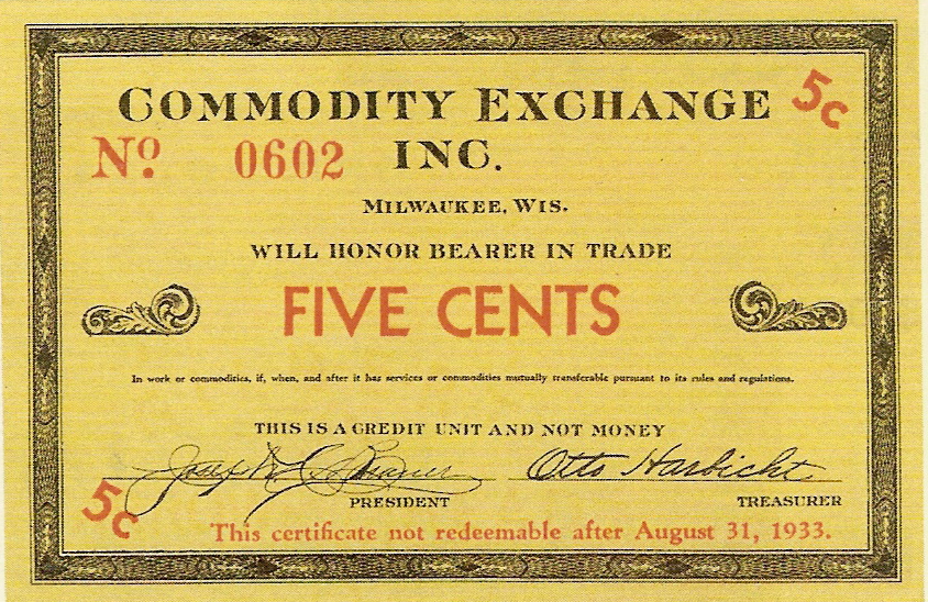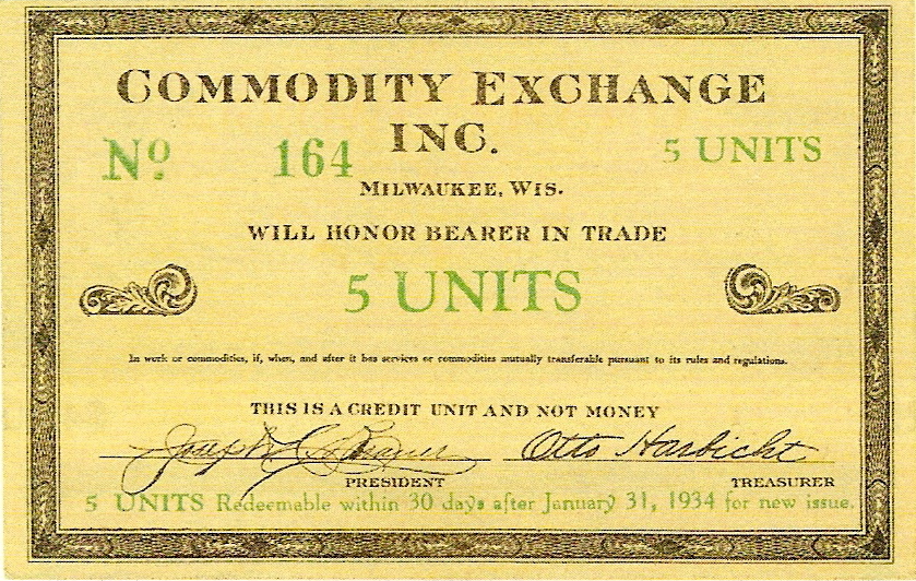 The change was necessitated because of a question as to whether the scrip violated Wisconsin law which prohibited a corporation from issuing money or an equivalent for money. Ultimately, the Wisconsin Attorney General opined that the Exchange’s barter scrip was legal even though the scrip denominated in dollars and cents.