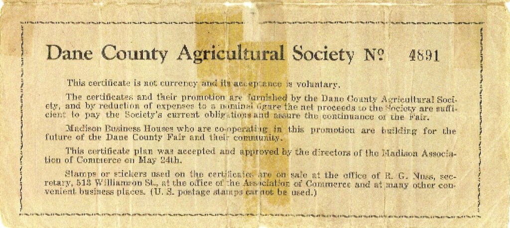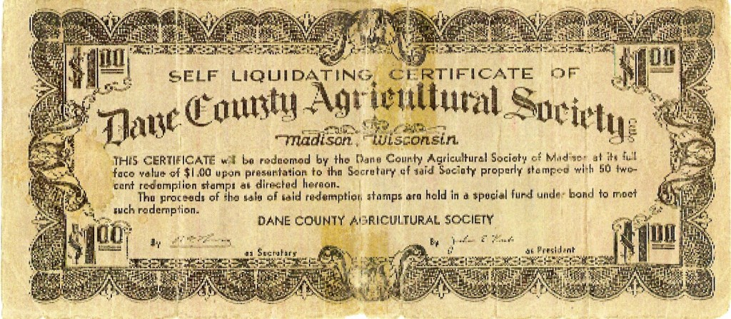 In mid 1933, the Dane County Agricultural Society found itself almost $9,000.00 in debt from the 1932 Dane County Fair. Influenced by the seeming success of the stamp scrip circulated by the Central Wisconsin Fair in Marshfield, the Dane County organization proposed issuing self-liquidating stamp scrip to retire its debt.