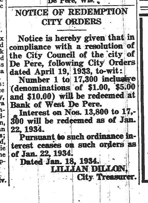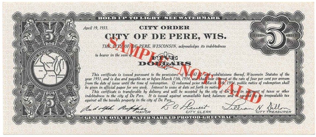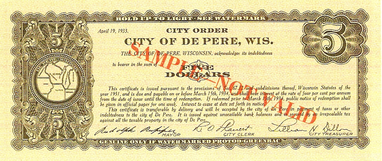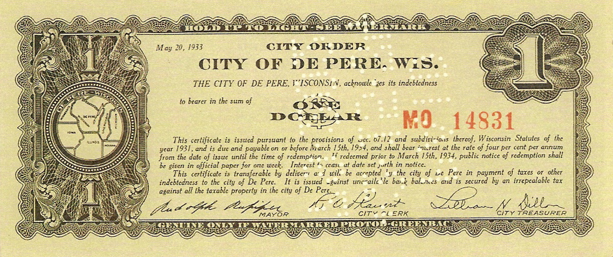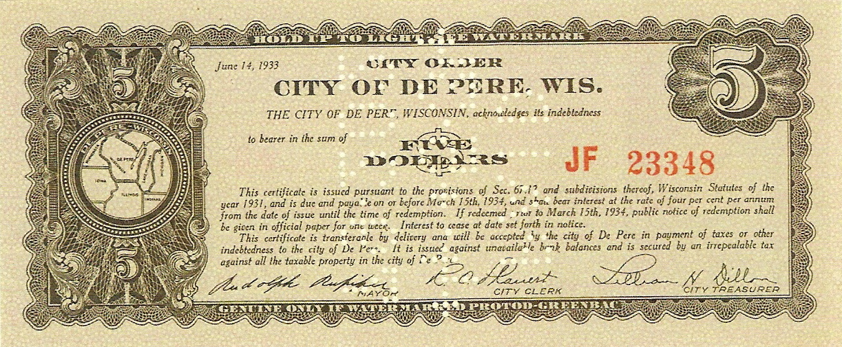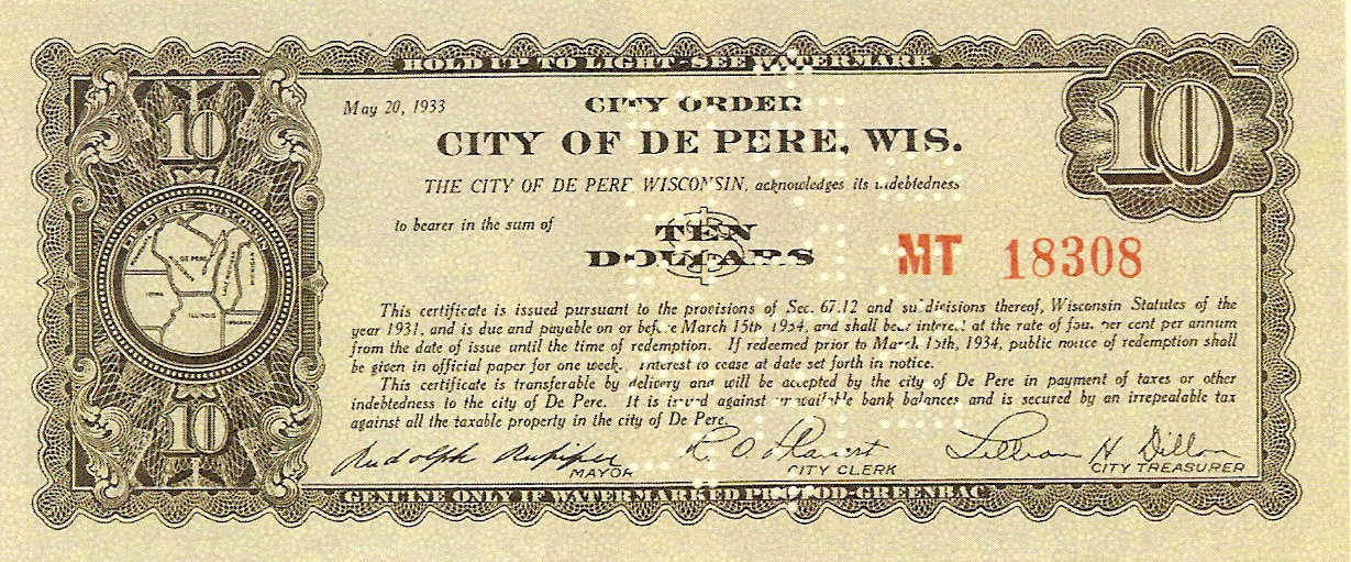 . . . All city officials, employees, teachers, laborers and business men who have money coming from the city will be given scrip in payment for their services and they, in turn, will pass it to whoever will take it. As this new circulating medium draws 4 per cent interest it is believed it will be accepted gladly when it is known that it is backed by the city’s credit. Practically all the scrip will be circulated in De Pere.