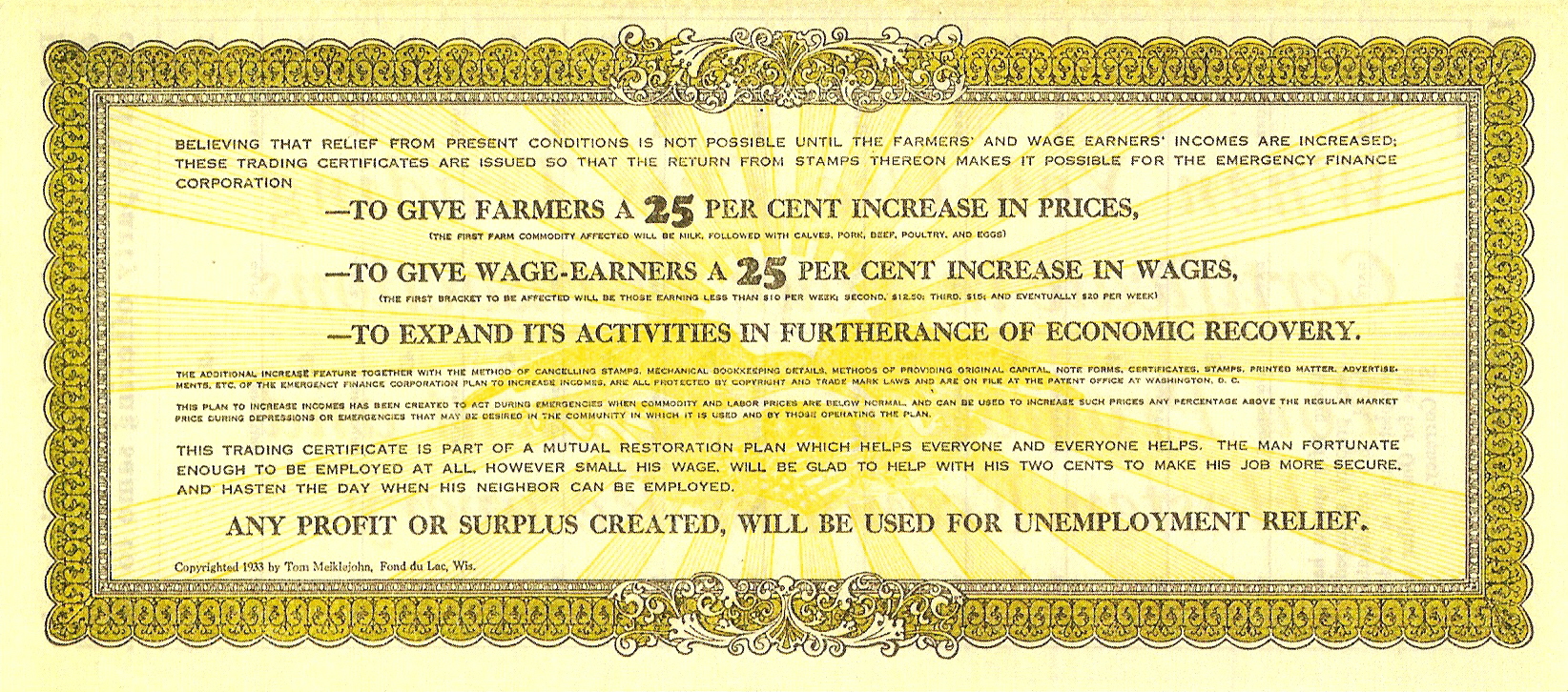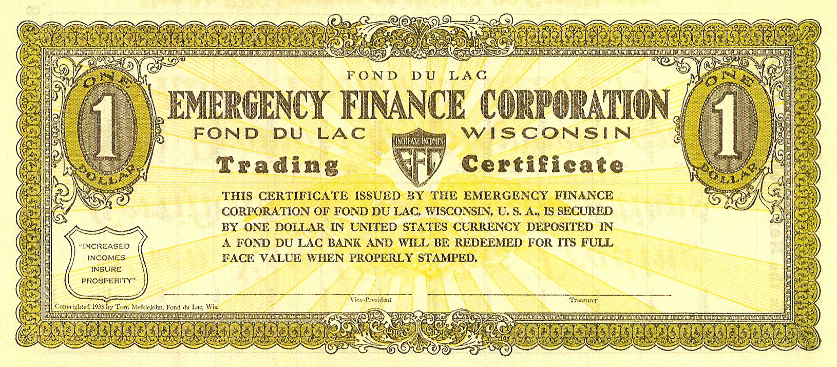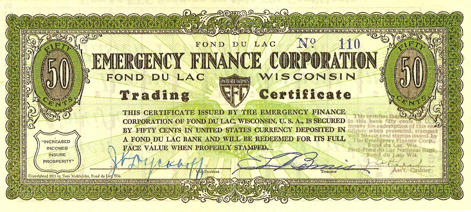 The Emergency Finance Corporation was the brainchild of Thomas W. Meiklejohn of Fond du Lac. Meiklejohn created the Emergency Finance Corporation in January 1933 for two reasons: (1) provide unemployment relief, and (2) provide aid to local farmers. His mechanism for achieving both of these goals was a form of stamp scrip.