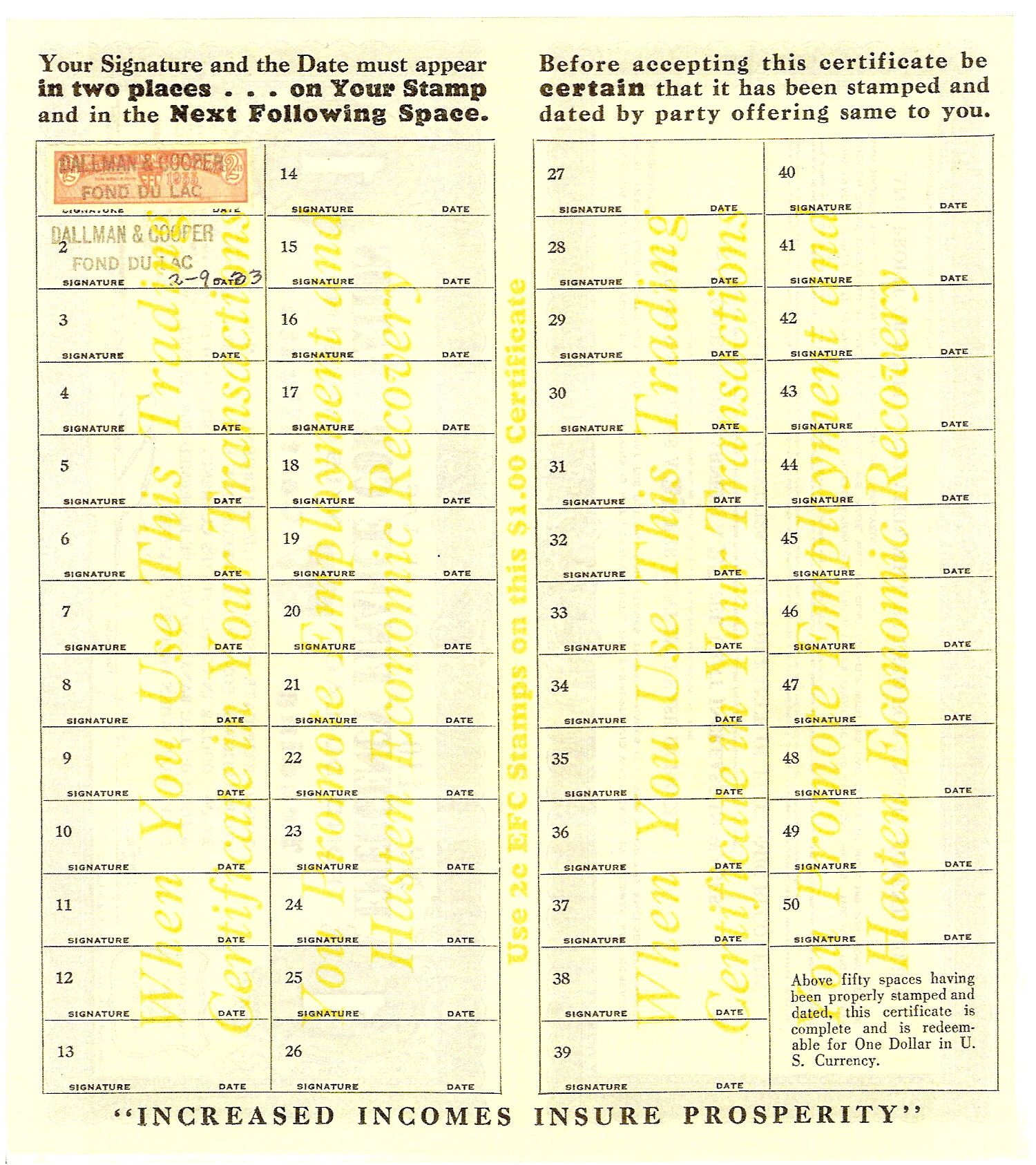 Circulation of the scrip required affixing a $.01 stamp for every half dollar of scrip per transaction. After 50 transactions, the scrip was redeemable for cash as it had been fully liquidated by the purchase of the stamps. The profit generated by the scrip was used for unemployment relief.