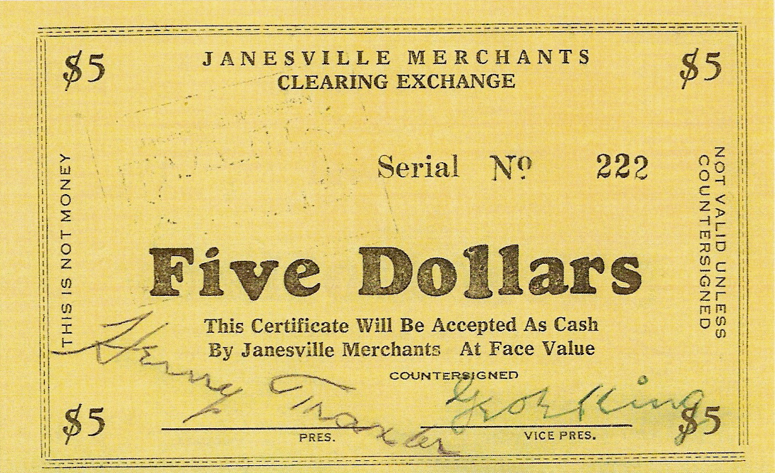 Janesville business and civic leaders met several times over the weekend of March 4 and 5, 1933 to discuss the state banking moratorium. They settled upon a scrip plan run by the Janesville Merchants Clearing Exchange. The Exchange was set up in the Merchants and Savings Bank of Janesville.