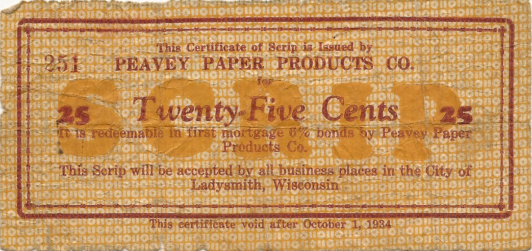 The Peavey Paper Company bought a closed paper mill in Ladysmith in early 1933. By the summer the mill was operational. The company’s expansion required more money than the company could borrow given the economic conditions. In November 1933, the company proposed paying its employees partly in cash and partly in scrip.