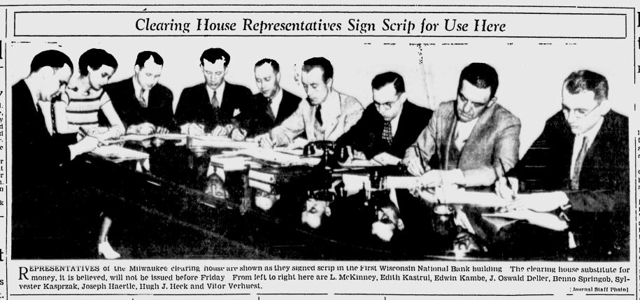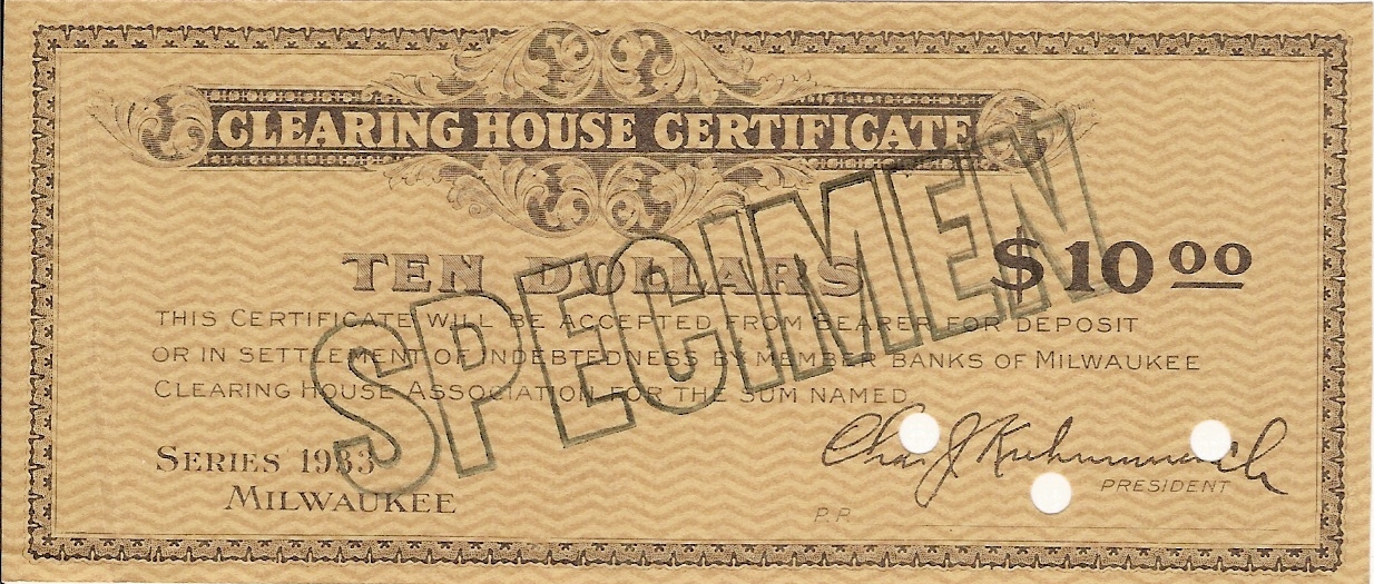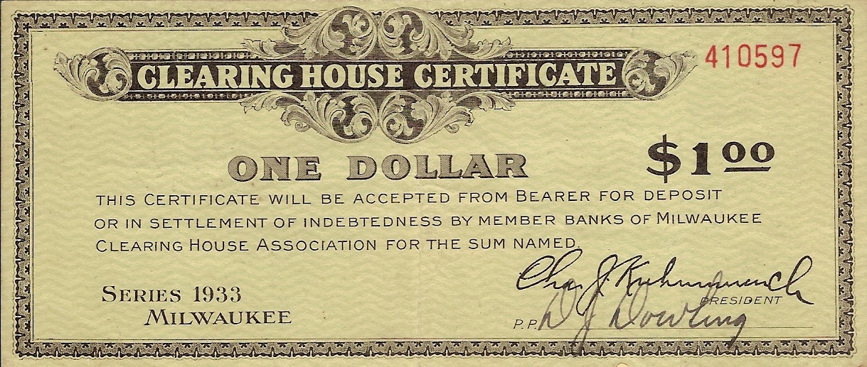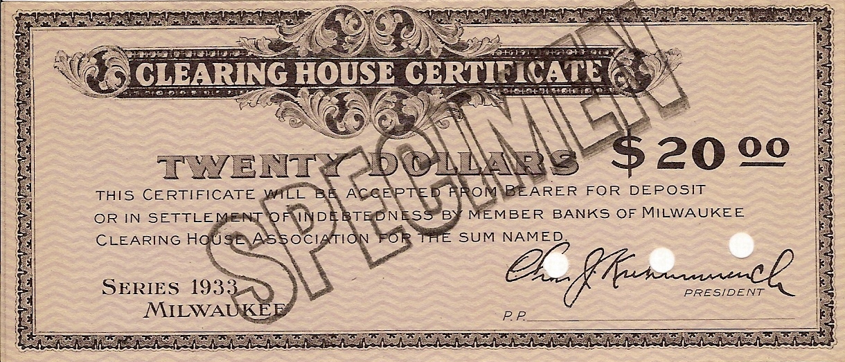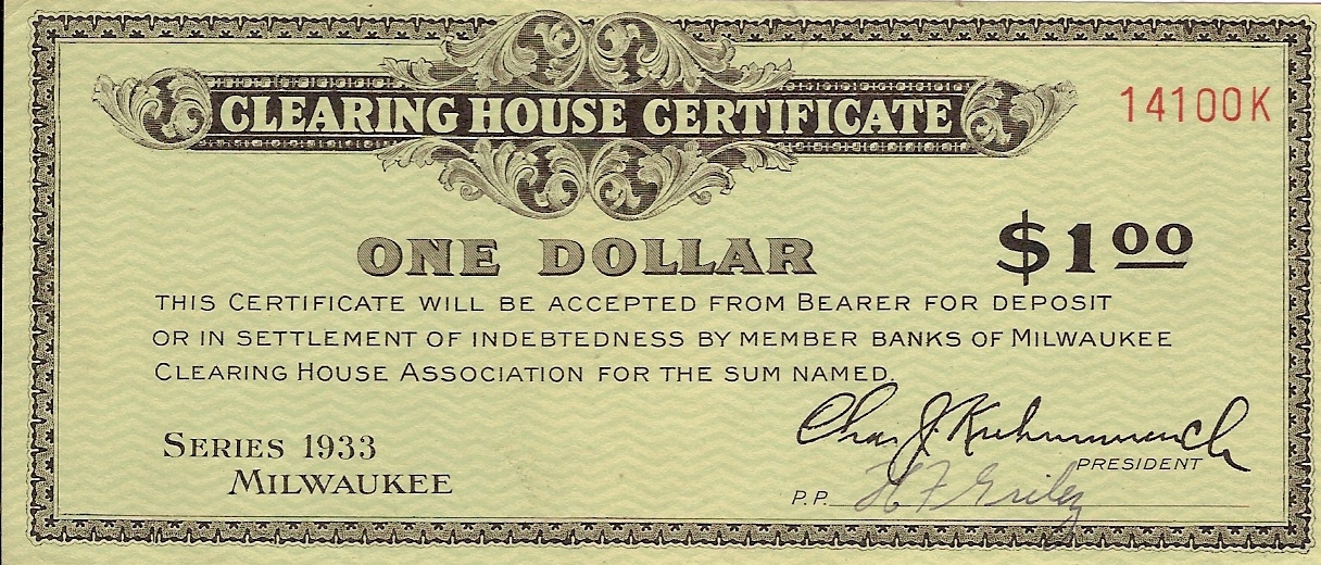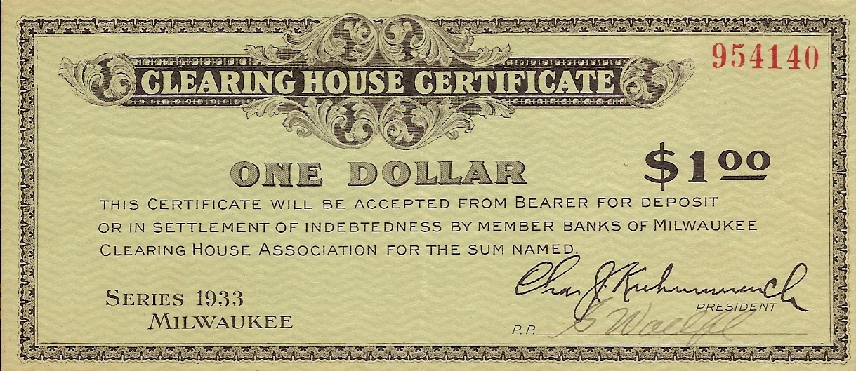 The Milwaukee Clearing House began to make plans to issue clearing house certificates on March 4, 1933 when Governor Schedeman ordered the closing of Wisconsin state banks. The Clearing House had issued scrip during the Panic of 1907.