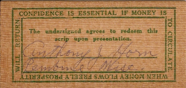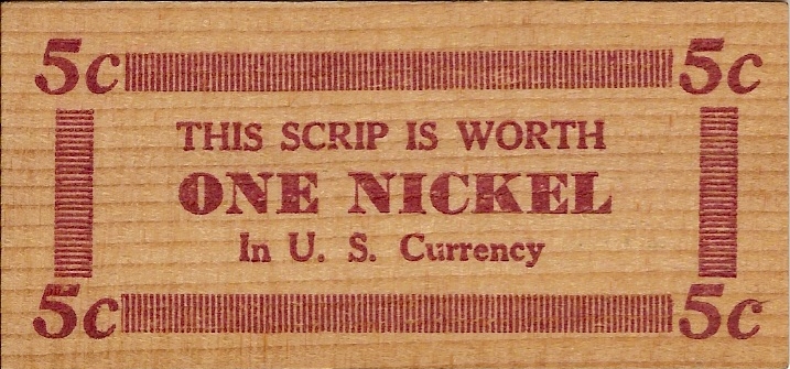 Anthony J. Horn issued wooden scrip in $.05 denominations identifying Pembine as the place of issue. Horn was from Chicago and similar pieces are known with that city’s name on them.