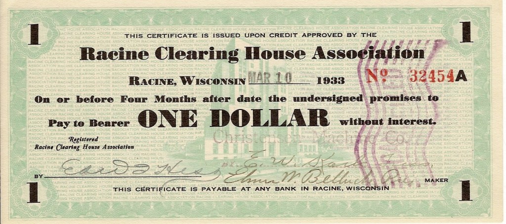 Racine was the third largest city in Wisconsin in the 1930s following Milwaukee and Madison. Like its larger neighbor to the north, Racine was a manufacturing center. There were two types of scrip issued in Racine — Clearing House Scrip and barter scrip from the Racine Labor Exchange.