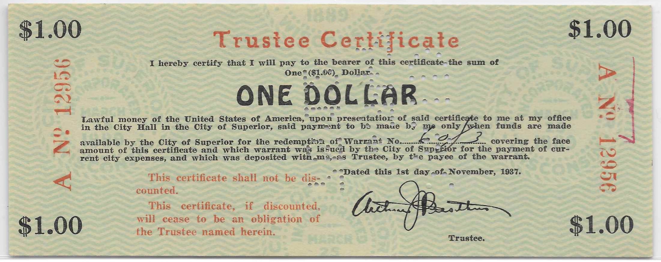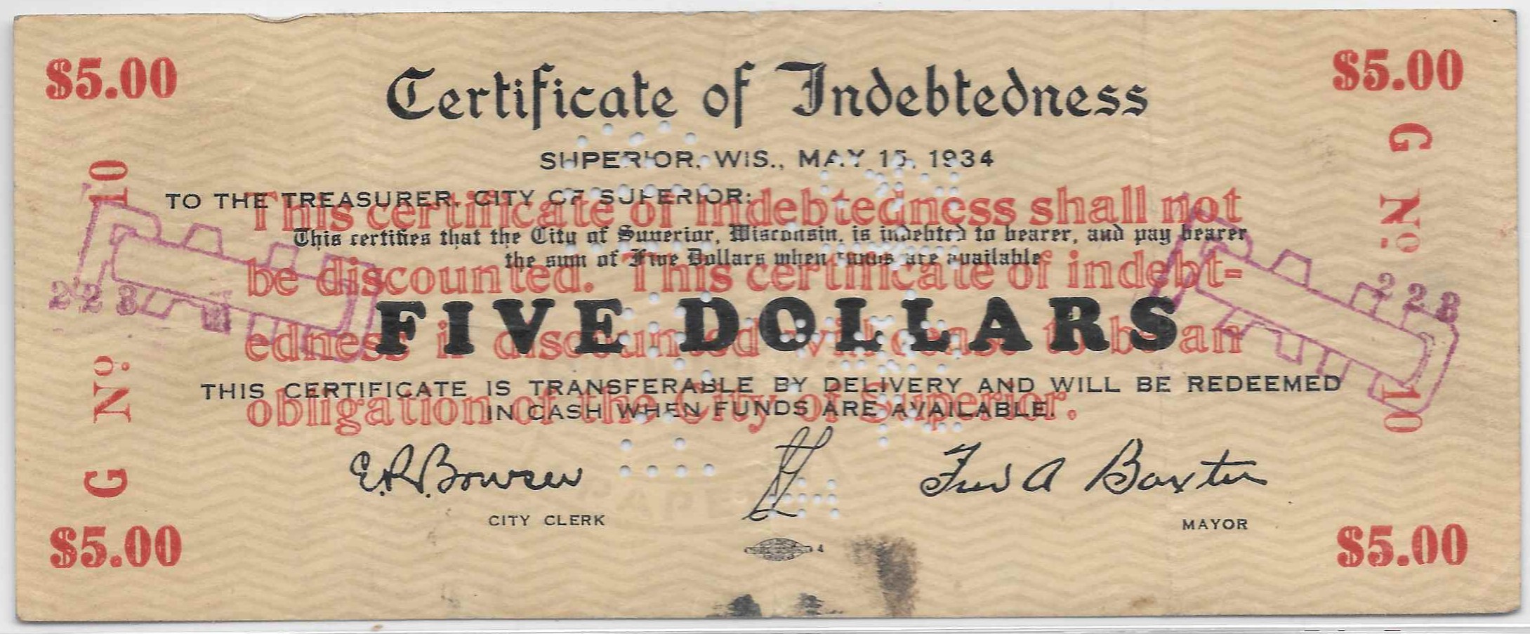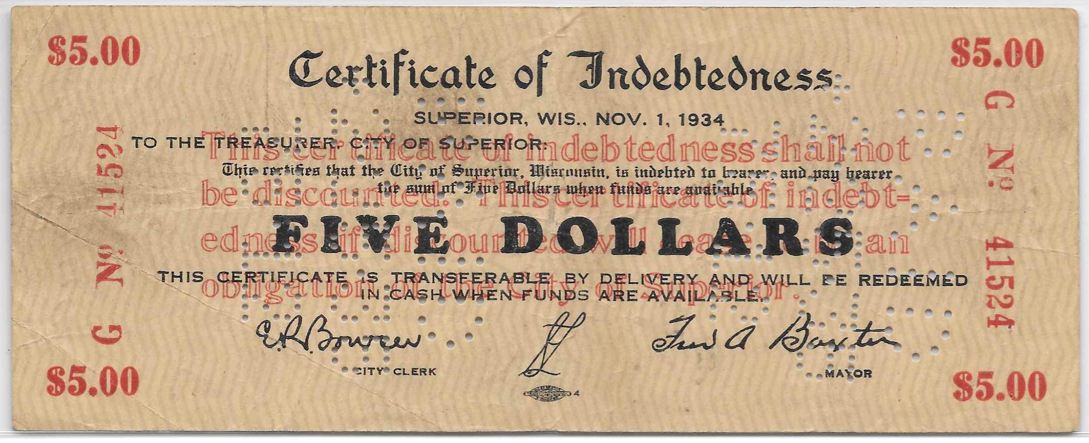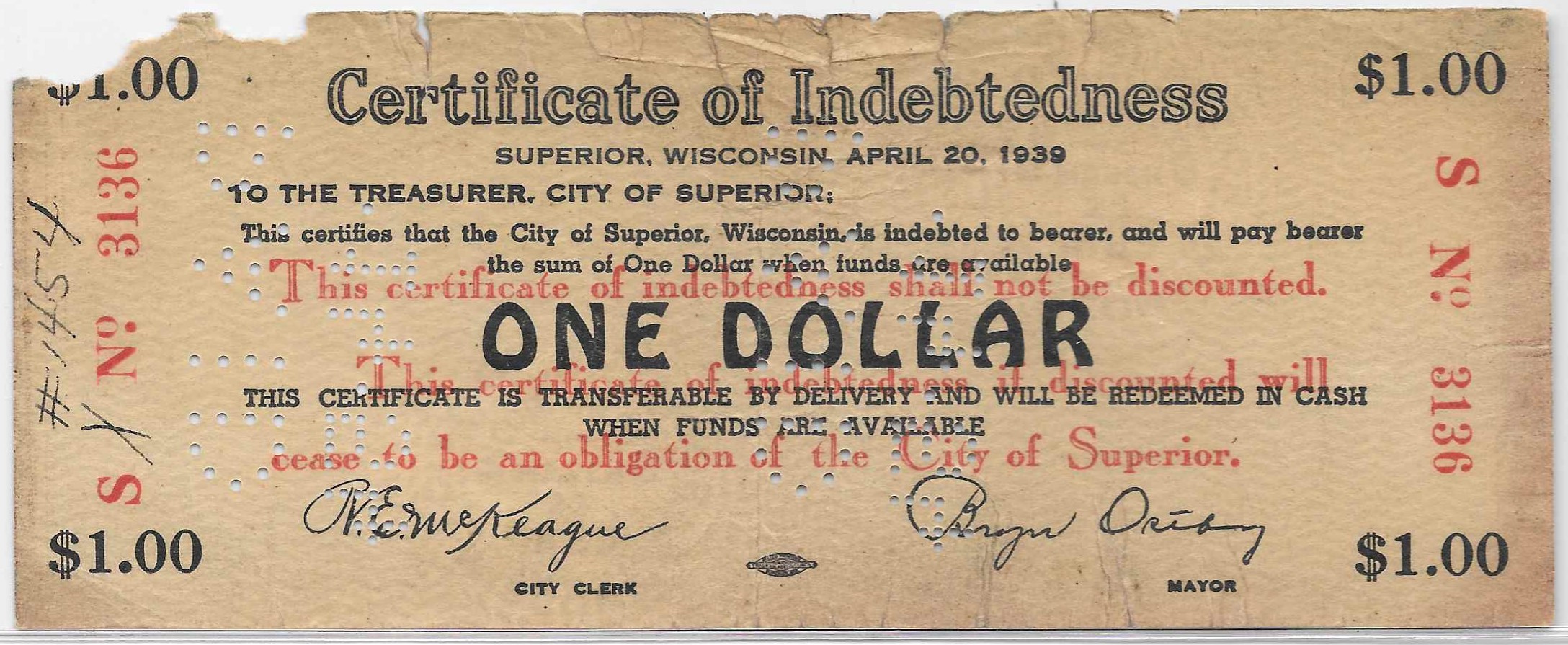 The city of Superior issued scrip for a longer period of time than any other municipality in Wisconsin. Like other municipalities it suffered from the double whammy of declining real estate tax collections and money tied up in closed banks. A half million dollars of the city’s money was tied up in 1933.