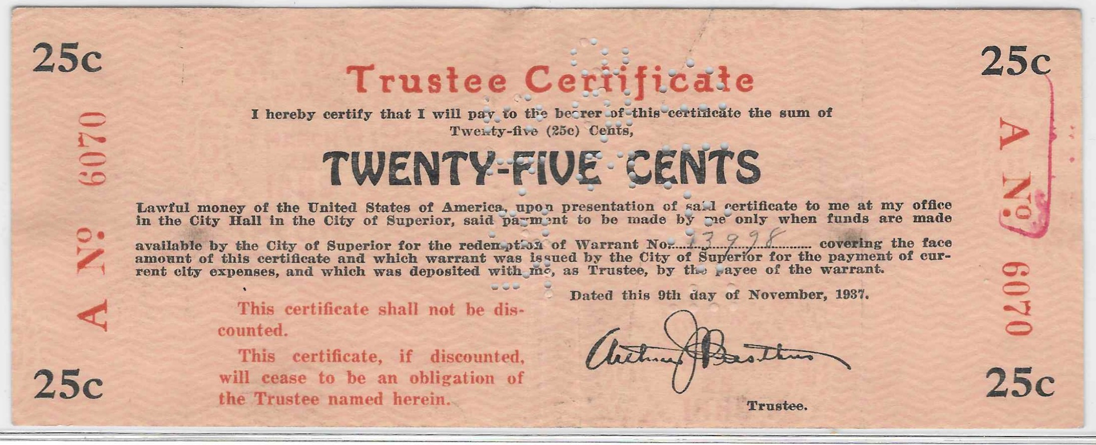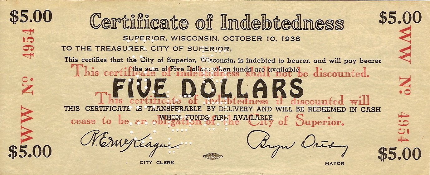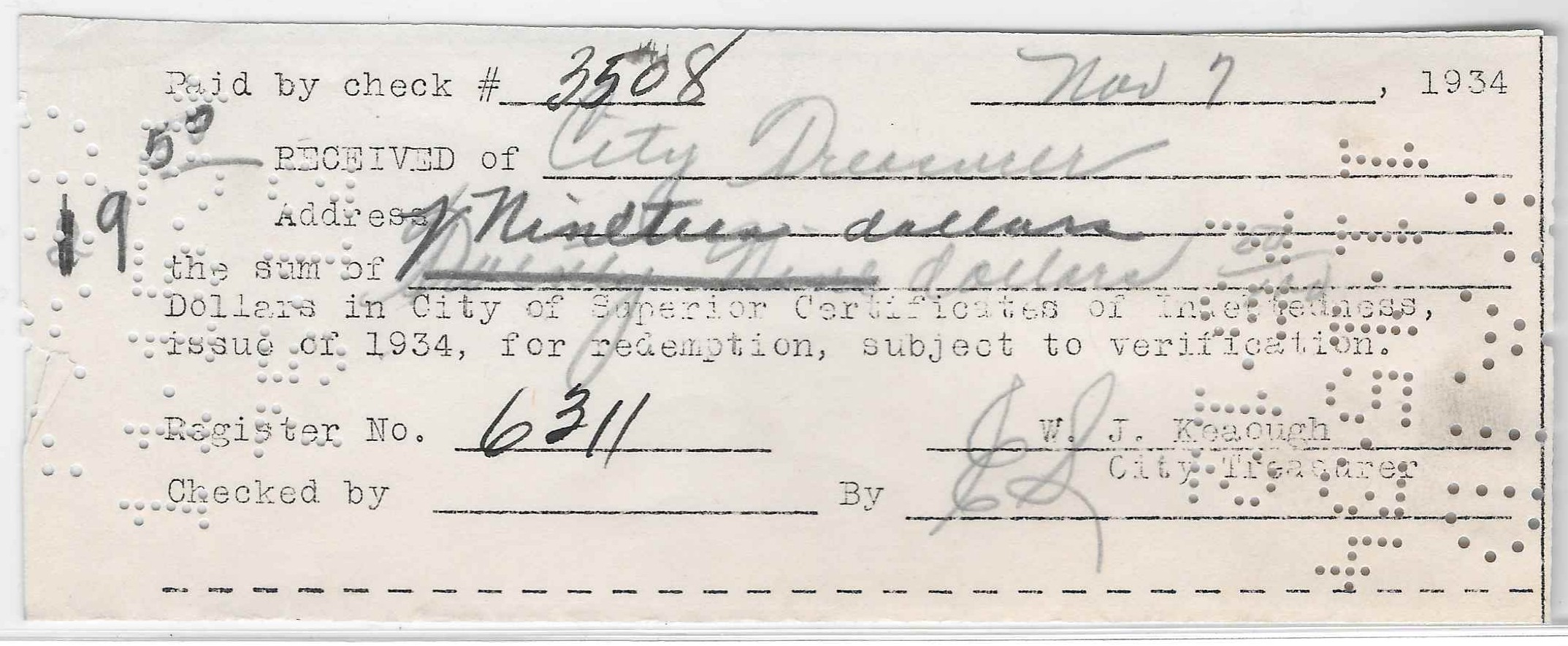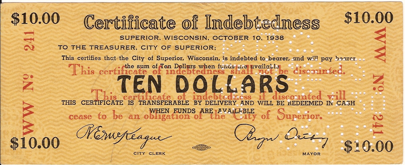 The city of Superior issued scrip for a longer period of time than any other municipality in Wisconsin. Like other municipalities it suffered from the double whammy of declining real estate tax collections and money tied up in closed banks. A half million dollars of the city’s money was tied up in 1933.