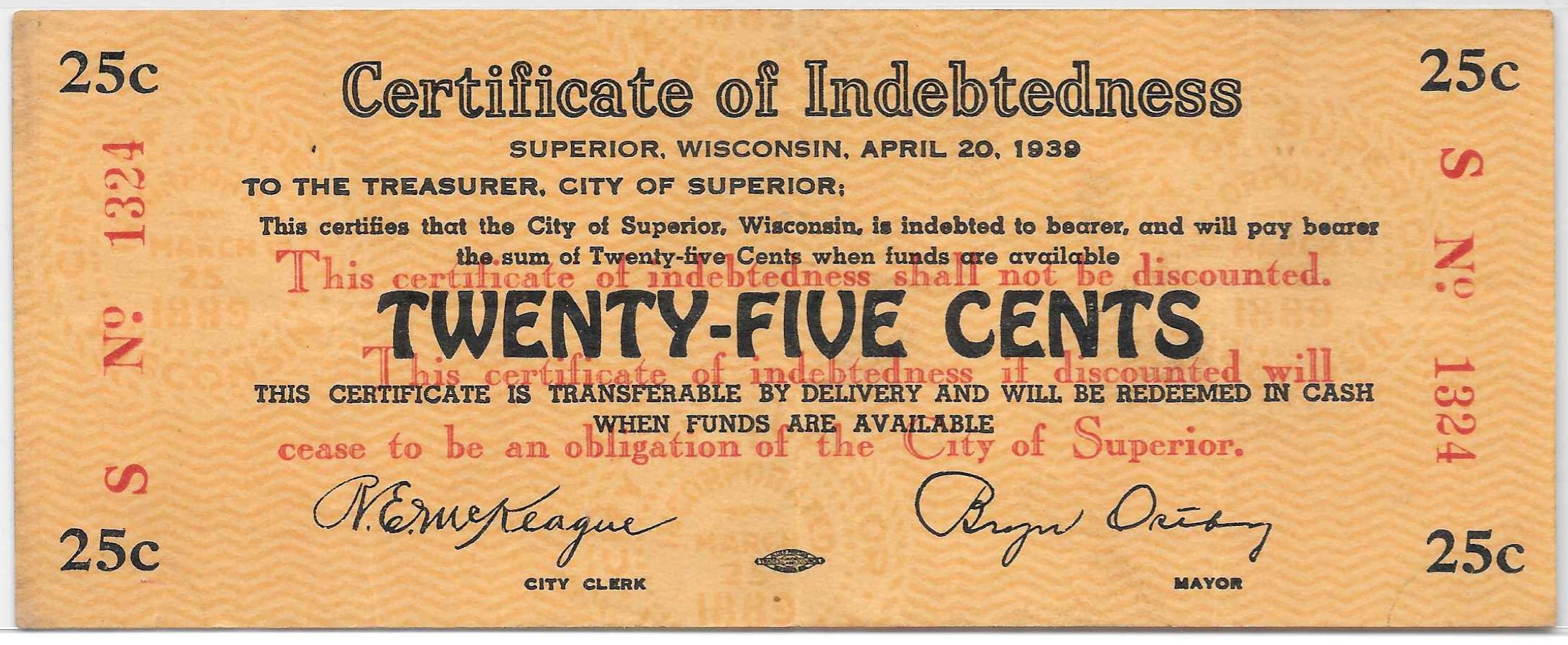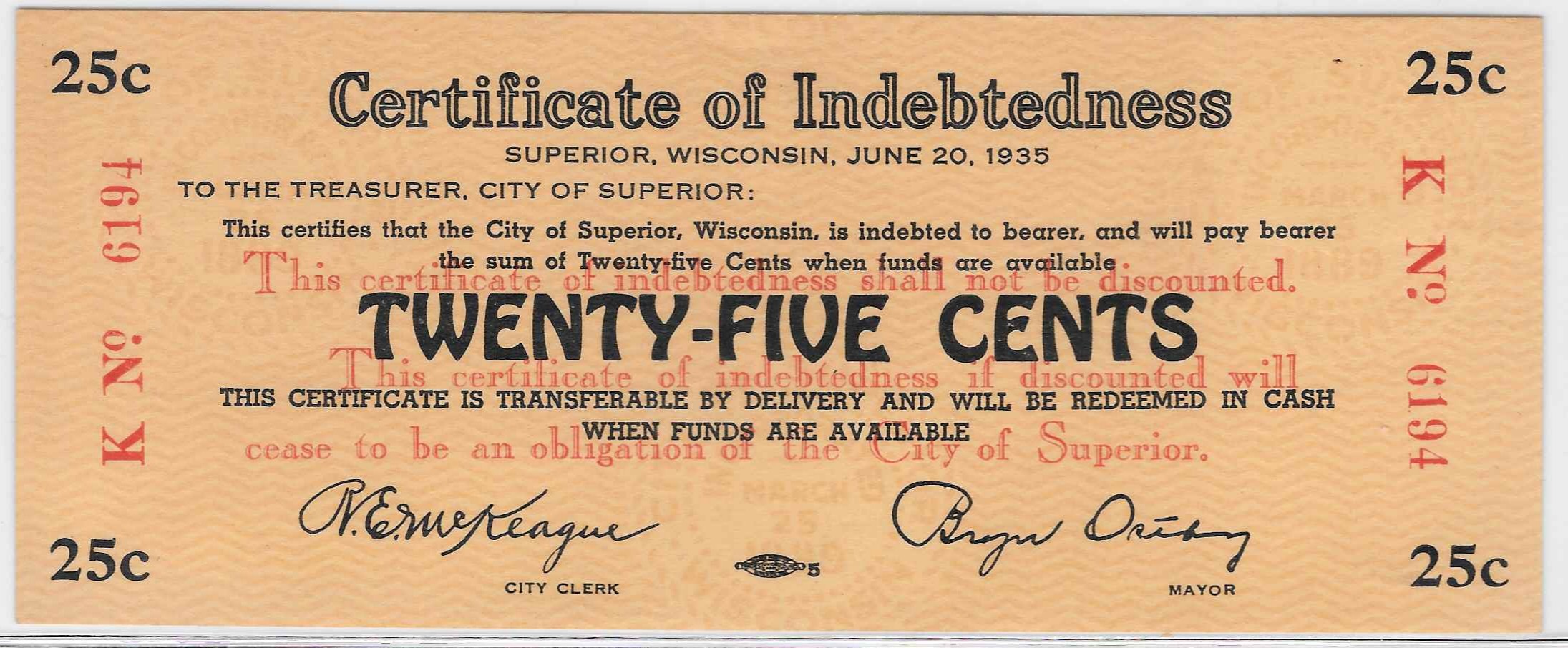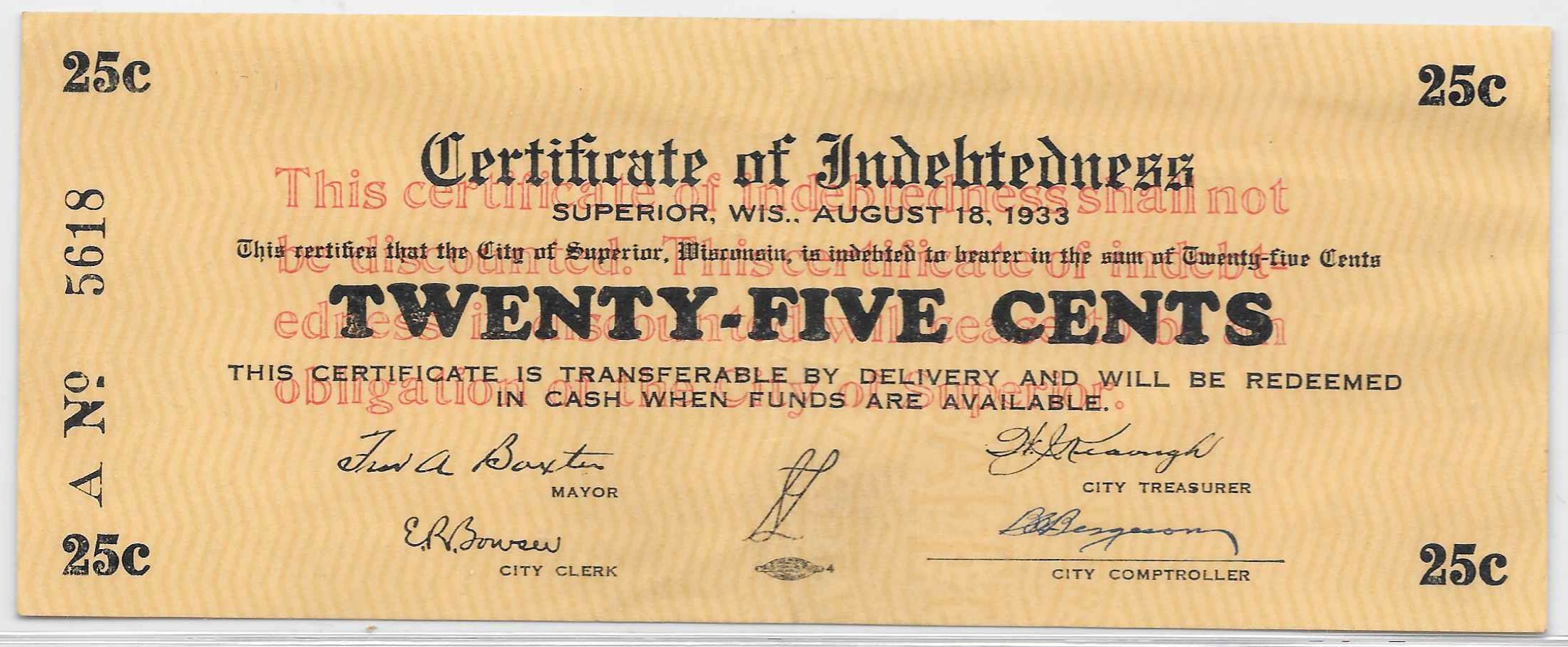 Superior’s first scrip issue was dated August 18, 1933. Since March 1, the city had been able to make its payroll only once. In August, $100,000.00 in scrip in denominations of $.25, $1.00 and $5.00 was paid out to employees for back wages. Additional issues were made in September and November 1933. There are conflicting reports of the total amount issued in 1933. One newspaper source indicates $450,000.00, another indicates $610,000.00 and the city itself reported $650,000.00.