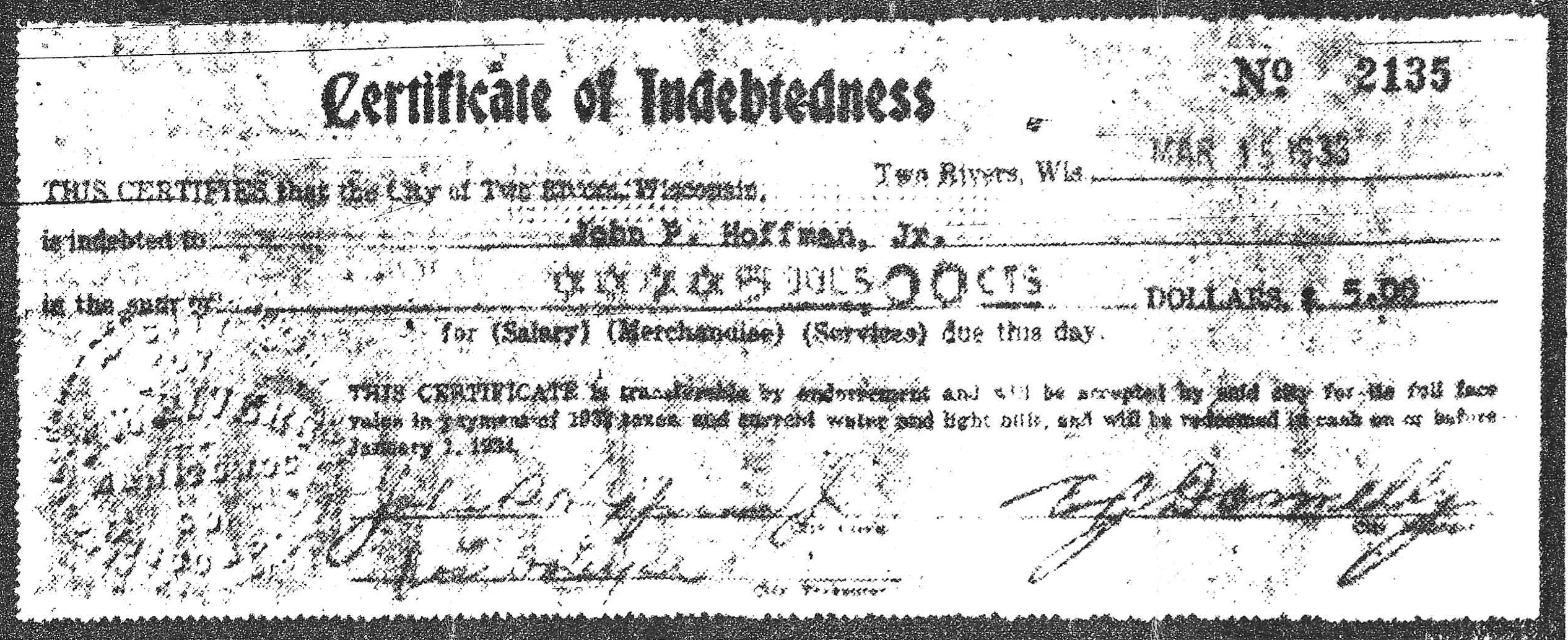 In March 1933 the City of Two Rivers found itself short of cash. Tax collections were $90,000.00 behind the previous year and $58,000.00 in city money was tied up in closed banks.